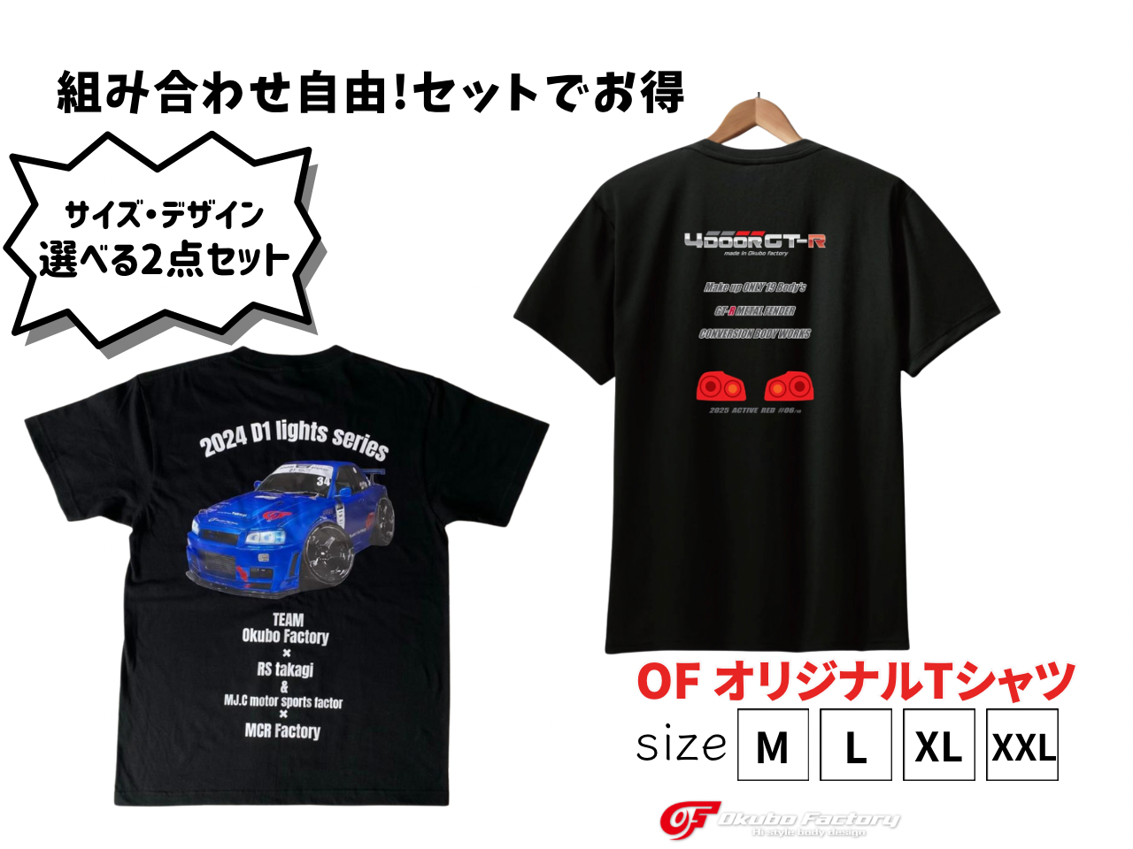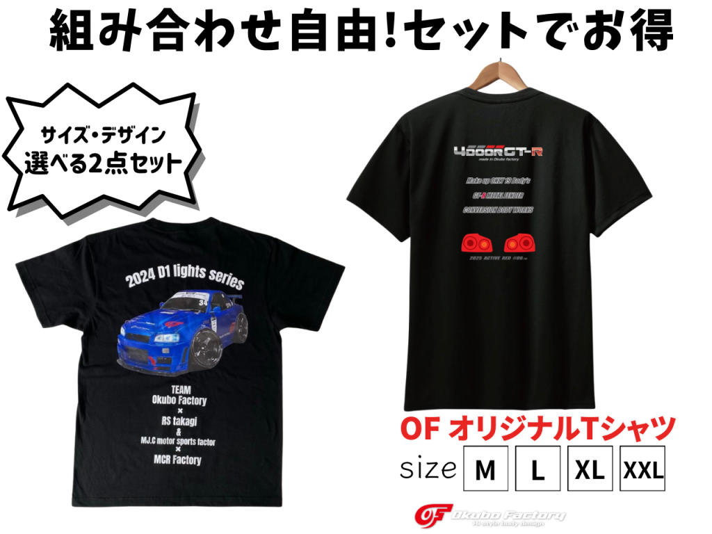 - 商品名:R34 限定選べる2点セット 2025年完成記念Tシャツ & D1Lights 応援Tシャツ オオクボファクトリー okubo factory T-shirt