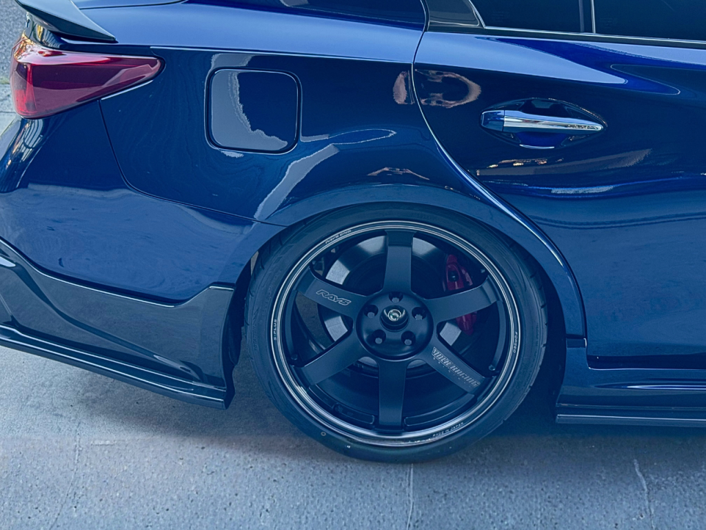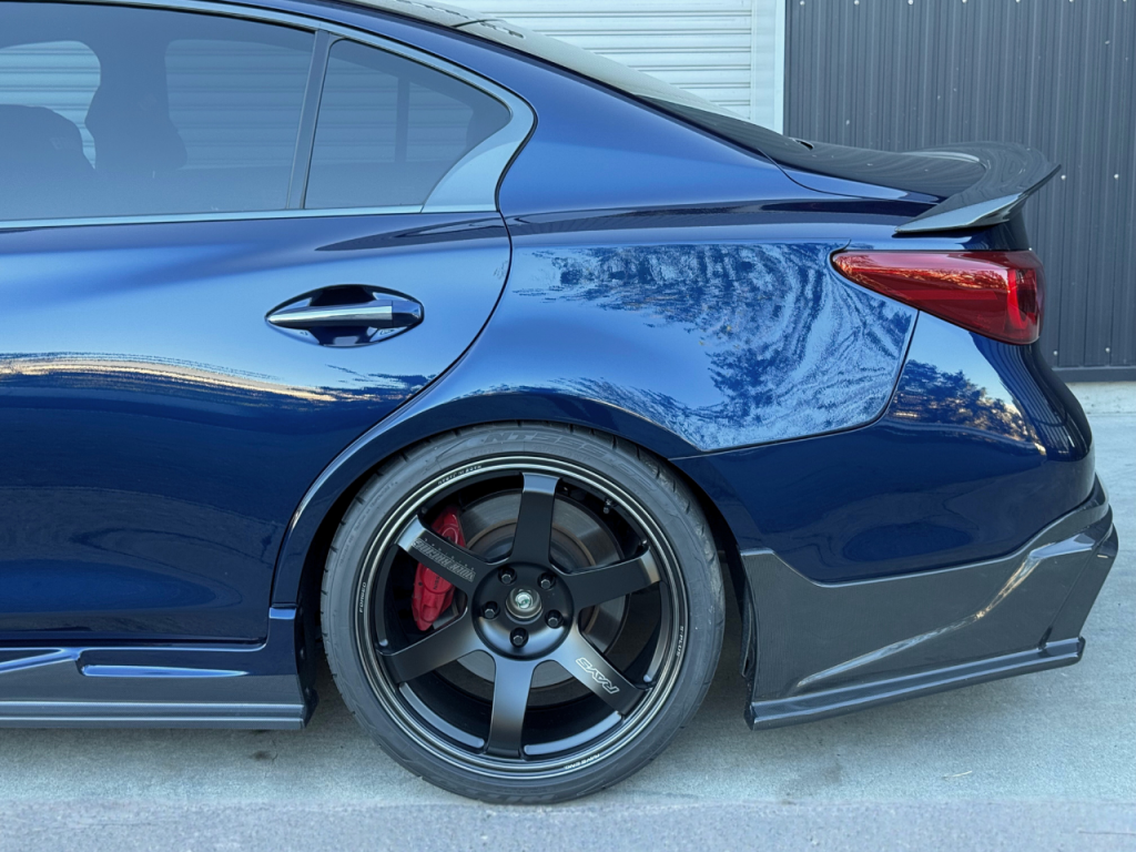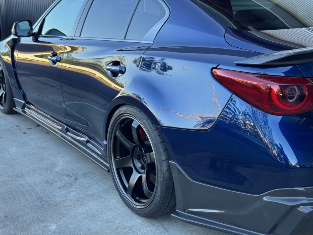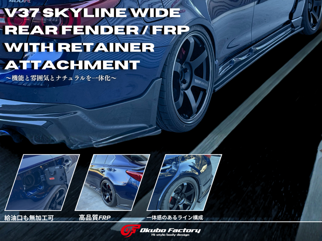 M3 由来のワイドデザインを V37 に最適化し、「スムージング無し・貼り付け感ゼロ」の自然なラインを追求したフェンダーです。